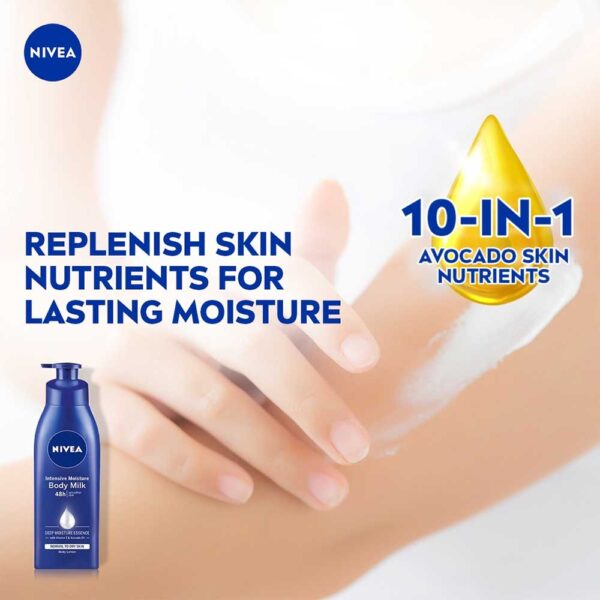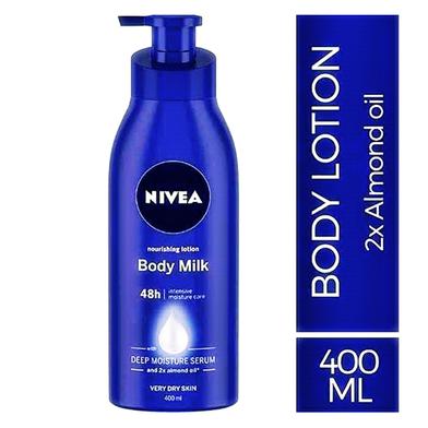 Nivea Body Lotion Nourishing Milk (400ml) is a hydrating lotion suitable for men and women. Enriched with almond oil and vitamin E, it deeply moisturizes dry skin, leaving it soft, smooth, and nourished. Made in India, it is ideal for daily use to maintain healthy, glowing skin.
